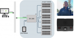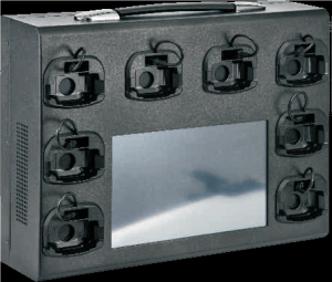 Sistem performant de încăcare acumulatori și descărcare a datelor din camerele video agent ce oferă posibilitatea sortării și clasificării datelor descărcate. Acesta face automat foldere pentru fiecare agent (cameră video) și descarcă toate datele în folderul alocat. Echipamentul permite conectarea prin rețea la un data-center