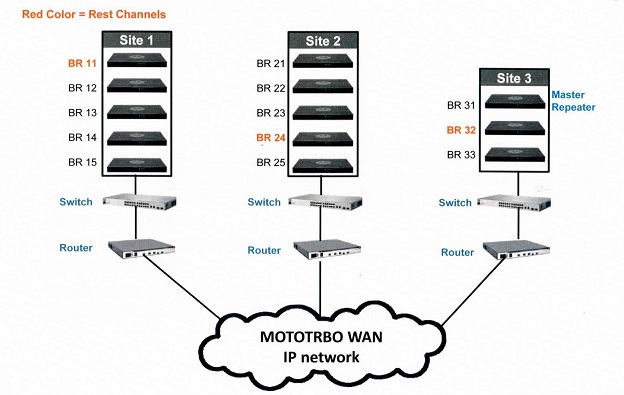 Pentru extinderea acoperirii pe mai multe zone se poate utiliza sistemul IP Site Connect (IPSC). Aceasta se poate face legând în rețea mai multe repetoare (max.15) cu o capacitate de până la 200 de utilizatori pe site. Avantajul este că repetoarele sunt conectate tot prin rețea și pot fi programate pe frecvențe din benzi diferite. De obicei un canal este programat pentru rețeaua locală și celălalt pentru rețeaua la distanță. Trebuie să rețineți că stațiile din seria 1000 (cele mai ieftine) nu pot fi utilizate decât în IPSC sau cu repetor clasic. În poza alăturată aveți un exemplu de rețea Capacity Plus multi site.